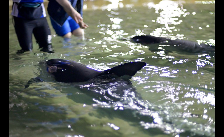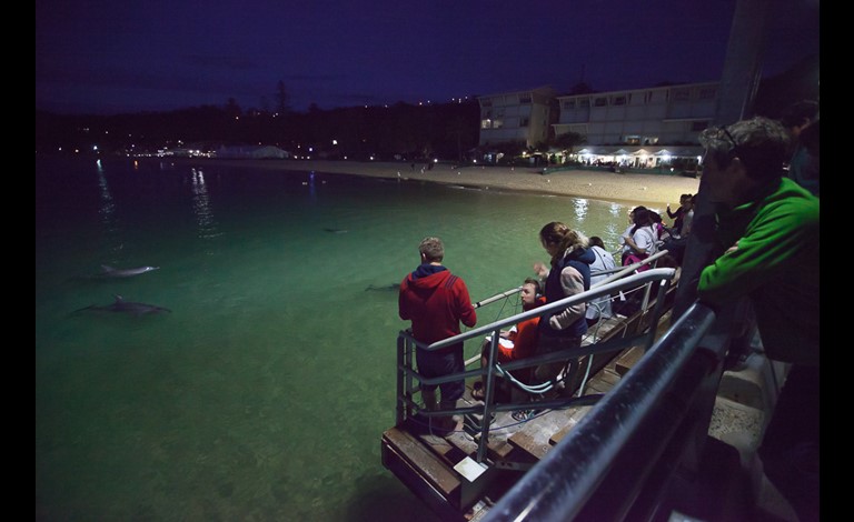 Since the establishment of the wild dolphin feeding programme at Tangalooma Island Resort, Marine Education and Conservation Centre staff have documented the behaviours and interactions of wild bottlenose dolphins that visit the shores of the resort each evening. Over the years, the wild dolphin feeding experience has become a huge drawcard for holidaymakers visiting from all over the world, as up to 11 wild bottlenose dolphins greet Tangalooma Dolphin Care Team staff and resort guests off the Tangalooma beach.