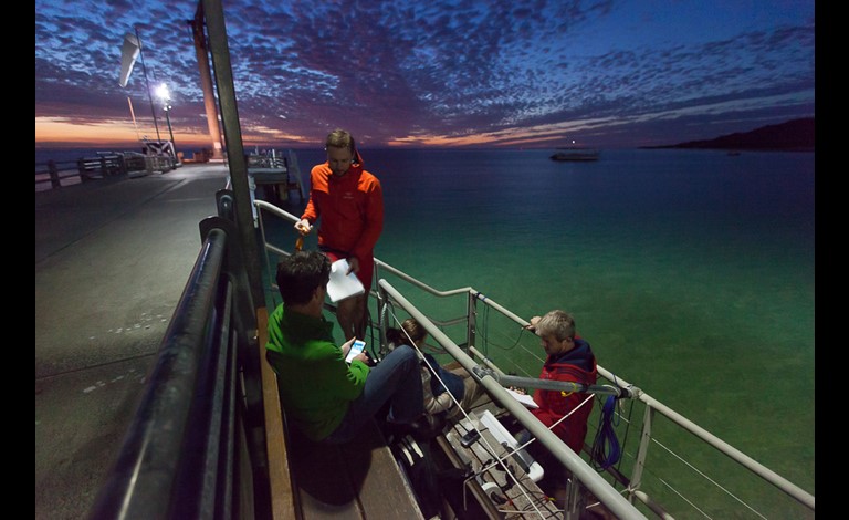 Katya: We have three hydrophones in the water that are constantly recording the dolphins' sounds. Two are located under the jetty and one is located off a buoy on the other side of the feed zone. Having three hydrophones strategically positioned in different areas of the feed zone, or where the dolphins actually interact each evening gives us the opportunity to localise the sound source and gives us a more defined representation of the dolphin sounds.