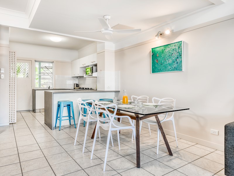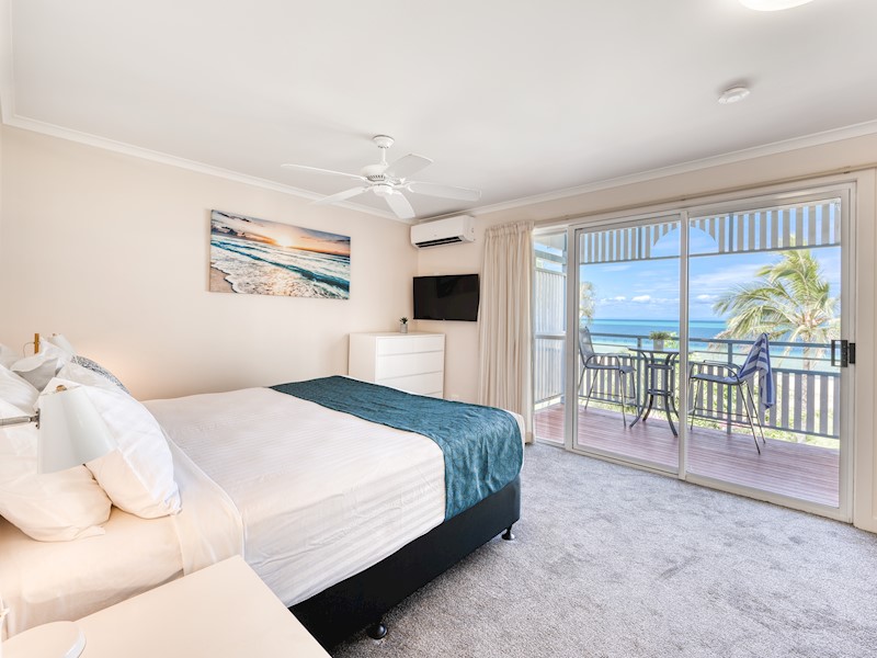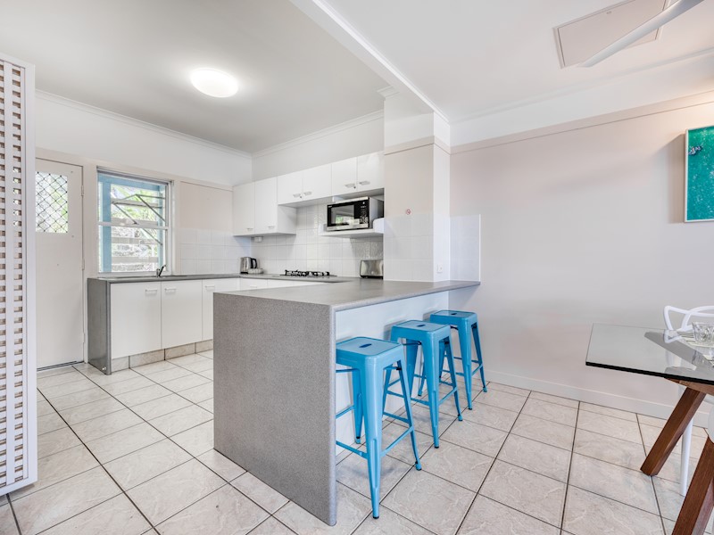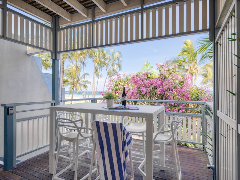 Spanning two levels, these two-bedroom townhouses feature two private balconies with spectacular views across Moreton Bay to Brisbane and the Glasshouse Mountains. Furnished with relaxed island décor, the villas feature ceiling fans throughout. You can walk out the front door and head straight to the beach out front, with manicured lawns for the kids to play on nearby. Some of the villas have car parks directly in front of them.